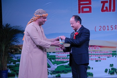 寧夏藍(lán)平文化創(chuàng)意產(chǎn)業(yè)園董事長王藍(lán)平先生代表組委會接受巴勒斯坦國穆罕默德先生的沙畫作品